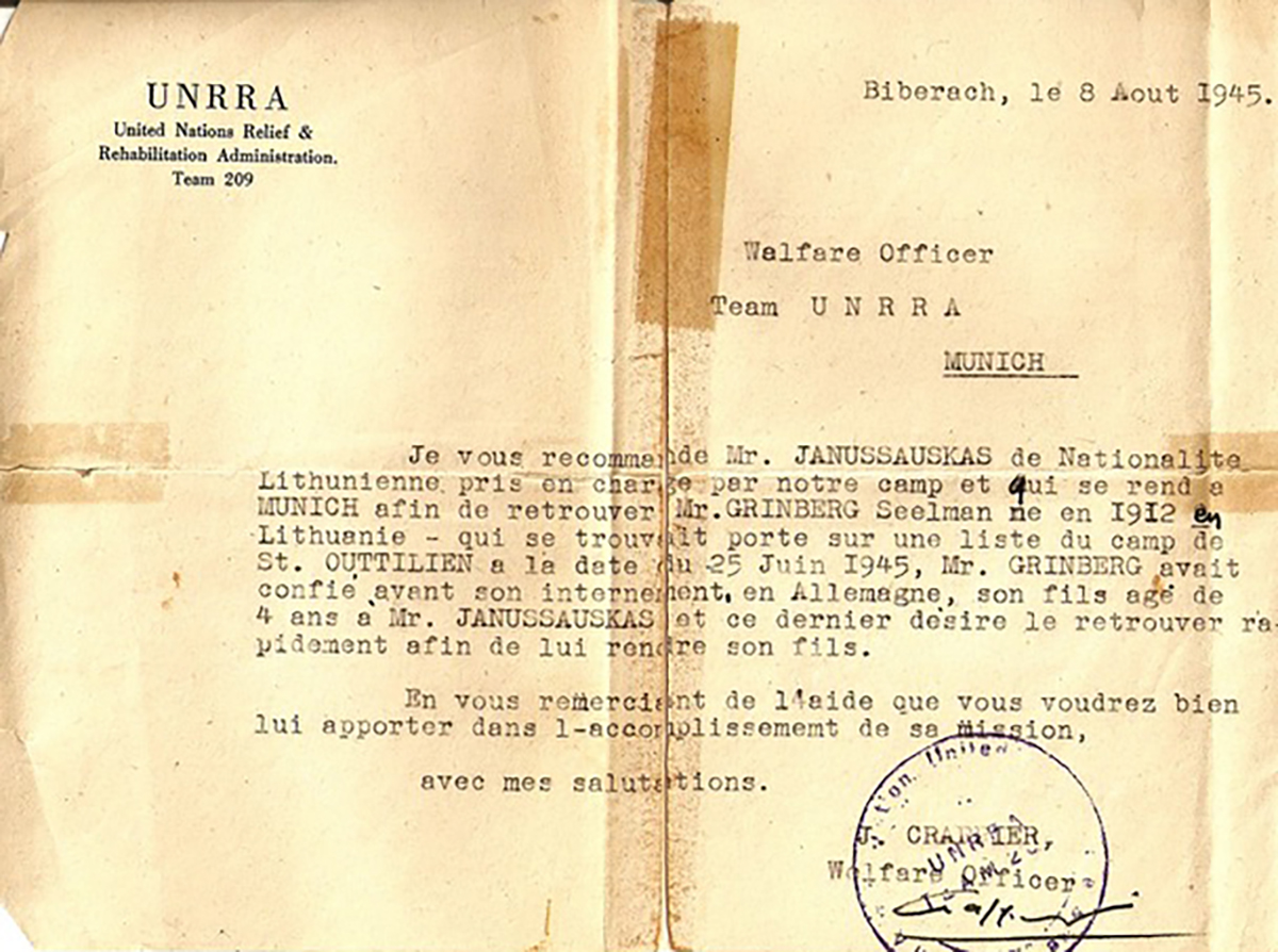 During the imprisonment at the Kovno Ghetto, Dr. Zalman Grinberg managed to smuggle his son Emanuel out of the Ghetto and entrusted him to a Lithuanian couple, Tamara and Matas Janusauskas. As the letter of the UNRRA officer from August 8, 1945, documents, they discovered the name of Dr. Grinberg in the list of Sherit Haplatah from June 1945. They left Lithuania and travelled to Germany to return Emmanuel to his father. The photograph probably shows the family reunion in August 1945 (from left to right): Dr. Chaim Ipp, unknown, Eva Grinberg, Matas and Tamara Janusauskas, unknown, Dr. Zalman Grinberg. Below: Emanuel Grinberg, unknown. The Janusauskas family stayed in the DP Hospital as part of the administrative staff until the transfer of the Hospital to Bad Woerishofen in May 1948 and emigrated to Australia in 1949.